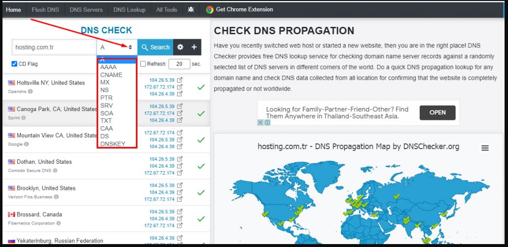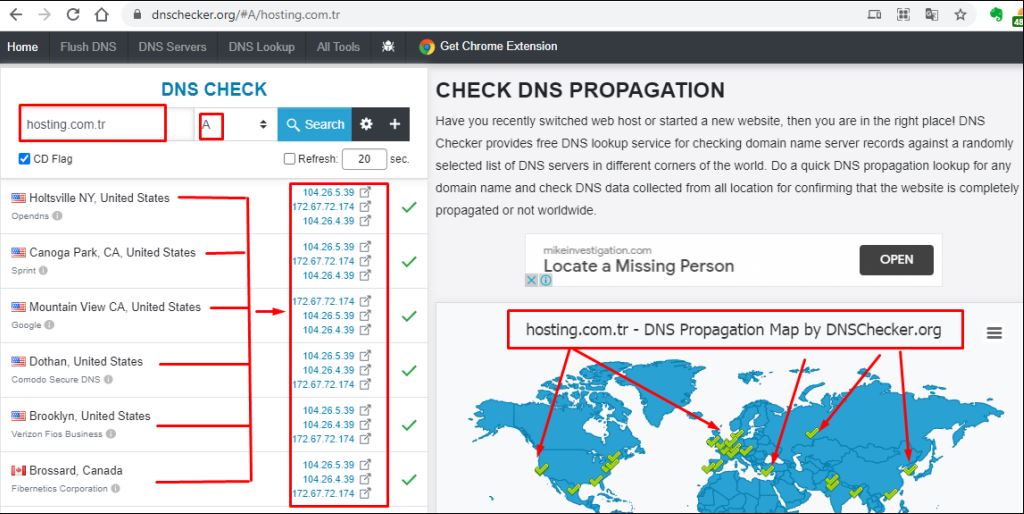 Bir alan adına ait IP adresini öğrenmek için ROOT (Kök) DNS sunucularına sorgulama yapmak gerekir. Bu iş için en pratik yöntem DNS Checker gibi web sitelerini kullanmaktır.dnschecker.org size herhangi bir alan adına ait IP adresi, nameserver sunucularının neler olduğunu kolayca bulmanıza yardımcı olur.